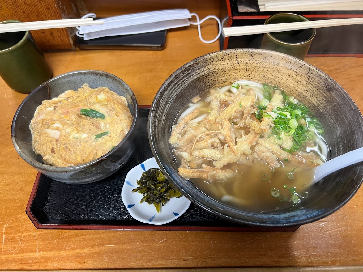 2번 셋트가 우동(또는 소바) + 계란덮밥 인데, 우동에 우엉튀김(고보텐) 토핑을 추가했어요